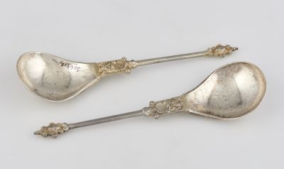 The repoussed ladle is drop-shaped the handle is decorated with an angel holding a shield in a broadening Renaissance cartouche on the front the shield shows the initials SLG. The reverse is engraved with the date 1679. The plain handle begins and ends in angel heads.