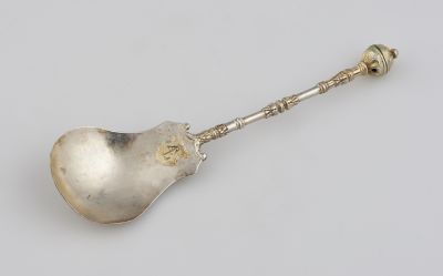 Shield-shaped ladle, with an engraved and gilt escutcheon on the inside, showing the initials ARB. The cast handle is of a Renaissance baluster shape with a double division. Its finial is a ringed and leaved ball.