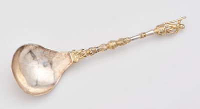 Drop-shaped ladle the baluster-shaped handle is joined to the back of the ladle. The finial is in the form of a putto holding a shield, standing on a hemispherical plinth. There is an engraved monogram MK and a spade on the shield.