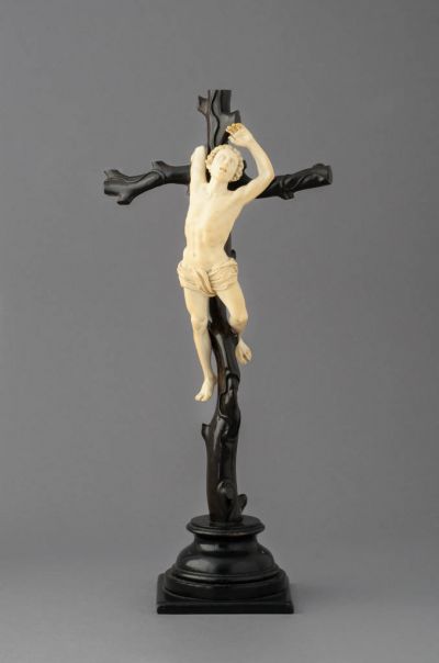 The figure is hanging on the cross by his right hand stretched backwards, his left hand raised above his head, his body is contorted. His eyes are fixed on the sky, his mouth is open. With his raised left leg he feels for a support. He wears a loincloth. Together with its companion piece (Cat. 1.43.) and with the figure of Christ on the cross, it might once have been part of a Crucifixion group.