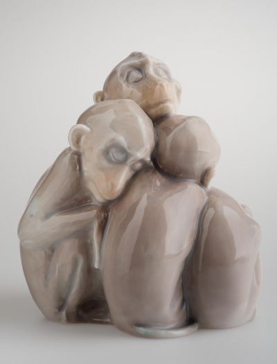 Sleeping chimpanzees, nestling up to each other. The three monkey babies press close to the sitting mother monkey. The naturalistically shaped statuette is painted in grayish brown, purple and light orange colours.