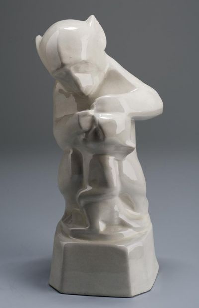 The statuette shows two figures over a short, octagonal plinth. The monkey with a bent head sits straight, picking fleas from its baby while holds the baby with its knees. The shape is not detailed, depicting only the most typical elements of the motion, in a soft arrangement, with geometrical blocks. The characteristic shapes used by the artist can easily be recognized on this statuette, which has a dated and marked version from 1906, now in a private collection. The articles published in the 15th volume of the periodical Magyar Iparművészet (Hungarian Applied Arts), 1912, describe the role given the topic in Simay's drawings (pp. 1-6) and how he could communicated his constructivist principles in education, in the Hungarian Royal School for Applied Arts (pp.31- 38). The close connection of the school to the Wiener Keramik workshop is shown by the fact that the Hungarians had called a special teacher from Vienna to raise the standard of ceramic education.