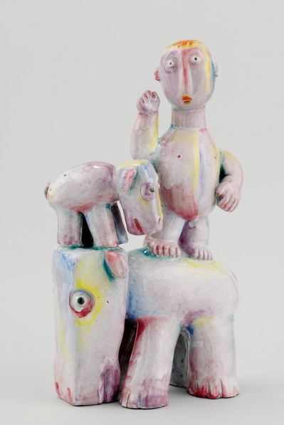 This small composition by István Gádor, a Hungarian master of 20th-century handcrafted ceramic, is expressive, humorous and emphatically naive—a true parody. It mocks affected, pretentious porcelain figurines, just as it ridicules all manner of posing and display of physical strength.