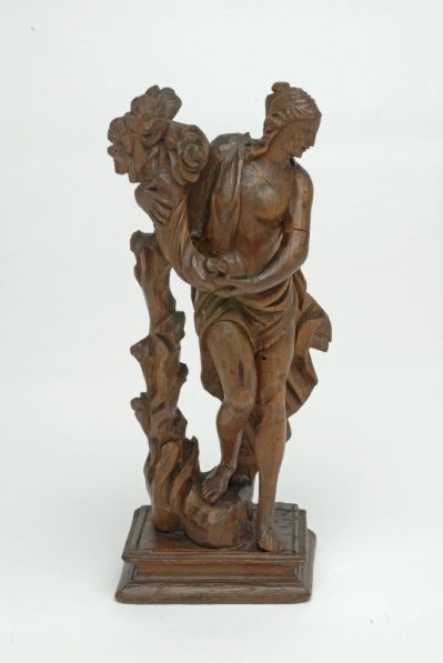 The figure of a woman wearing a veil is leaning against a trunk. There is a sheaf of wheat in her lap. It is one of the figures of an allegorical group of statues of the seasons, the pair of Cat. No. 4.22.