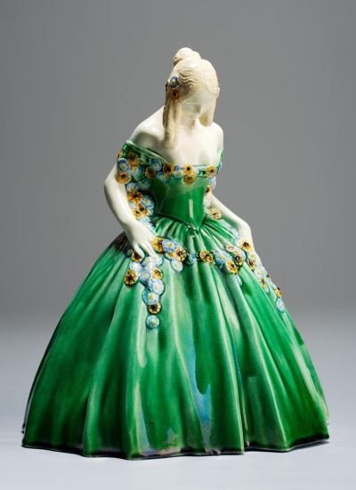 The statuette depicts a young lady, dressed in fashionable «Biedermeier» clothes, with her head bent down, holding a garland of flowers in her hands that are delicately supported by the large hoop skirt. The garland consists of blue, yellow and brown blossoms, curving softly in the middle of the dress, running around her slim waist and deep décolletage. Her fair locks are also decorated with three flower blossoms on each side. Viennese modem arts turned intentionally towards Biedermeier, since this rational, materialistic, comfort-loving yet reserved and elegant, bourgeois artistic trend was regarded to be the predecessor of Art Nouveau. The figures of Powolny are representatives of the wide-spread nostalgia for Biedermeier in the early twentieth century.