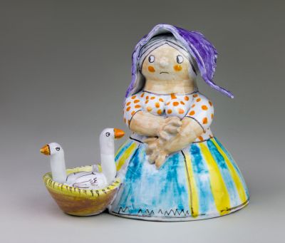 Techniques: | assembled from thrown parts; covered with white overglaze; hand-shaped elements; polychrome painting |