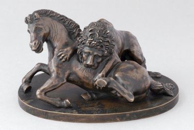 Stands on an oval bronze plinth, cast together with two animal figures. The composition is attributed to Giovanni da Bologna (1524-1608) it was taken up by many followers and was very popular in the 17th century.