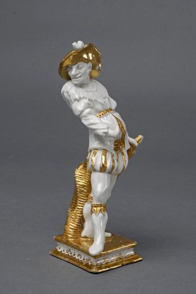 In the 16th and 17th centuries, a favourite public entertainment at Italian fairs was the music-and-dance form Commedia dell’ Arte. Travelling companies performed folk tales featuring pairs of opposites – master and slave, rich and poor, young and old, beautiful and ugly, loyal and deceitful, etc. – with caricature and improvisation. The players stood on a wooden stage, often in front of canvas scenery of a town or landscape. The members of the company always played the same figures, in the same costume. The audience could thus easily identify the characters, whose mere appearance set off laughter. The performance was full of ribald jokes and puns based on differences in dialect. For a long time, Commedia dell’ Arte competed with the plays of Moliere and later Carlo Goldoni. Prominent among the characters are young, always-hungry, lazy, sleepy, but crafty servants the Padrones, their masters, who combined all the worst characteristics of rich old people: meanness, ugliness, avarice the scholarly Dottores and the self-important, skirtchasing, boastful Capitanos. Pulcinella is the clever and stubborn servant, who always comes out the loser. This little Bottger-porcelain figure is one of the finest pieces in the porcelain collection, particularly remarkable for the refinement of its modelling. A close look at the tiny details of early Meissen porcelain reveals the glaze not to be perfectly aligned with the base porcelain. The fusible glaze tended to run into the drapery folds and tiny depressions of the sculpture, and so does not cover the figure evenly.
