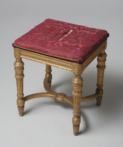 The stool stands on four flooted legs that are joint by two semicircular stretchers with a carved rosette at the juncture in the middle. The seat rail is carved with ribbon motifs, while the corners are decorated with carved rosettes in squares. The burgundy upholstery has leaf pattern.