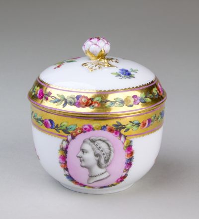 Sugar box with lid - Decorated with polychrome flowers and classicising portraits painted in grisaille
