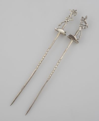 The skewers are shaped as a foil, with a dog on one hilt and a Cupid figure on the other.
