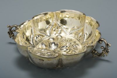 Oval, octofoiled form on the rim, at the join of the foils, are chased reversed flowers in its interior are bunches of fruit. On the longitudinal sides two cast scroll handles are soldered. On the exterior of one of the shorter sides a monogram M. S. is engraved on the other one a monogram G. B. L. The master's mark is near to one of the handles, on the exterior rim. There is no city mark. It is a work of good quality, and so must have been made after Sebestyen Hann had got his mastership, that is after 1675. Since from this date until his death in 1713 he was active in Nagyszeoen this object must have been made there. Earlier the master had worked in Locse.