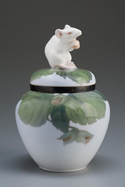 Sweets dish with lid - With a hazelnut branch pattern, with a mouse figurine on the lid