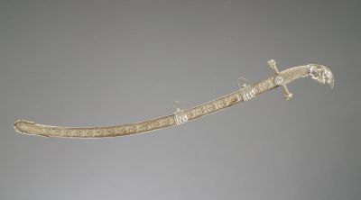 The damascened steel blade is attached to a hilt that ends in a fine cast head of Pallas Athene. Lion heads terminate both ends of the cross-guard which has at its centre, on both sides, a medallion. The first contains a full-length figure of Pallas Athene, the other a ship. Inscribed on the tip of the sheath is the inscription Anton Rossi in Wien (Anton Rossi in Vienna), with an unidentified goldsmith's mark I AH and the mark for Vienna 1807. Silver filigree adorned with embossed and chased vegetable motifs cover the sheath, to which suspension rings are attached by clasps in the form of lion paws.