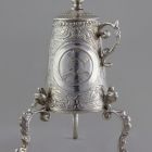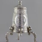 The cylindrical body narrows towards the top it is supported by three curved, jointed legs that end in female heads. The whole surface is covered with rich foliage. There are three oval medallions in the middle, depicting two male and a female portrait. The double-scroll handle is jointed, the cover is decorated with repousse string of pearls. Equipped with a bun finial on the top. The small spout is soldered to the bottom of the body, turned downwards.