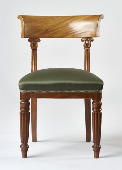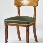 Each chair stands on two jointed, fluted, baluster- shaped legs at the front, while the back legs are curved. The seat is trapezoid the back is bent backwards and curved on the sides. It is supported by the back legs. Close analogies can be found in the small dining room of Petworth House, West Sussex. These were manufactured in 1801, precisely for this building, by John Kerr, a London carpenter.