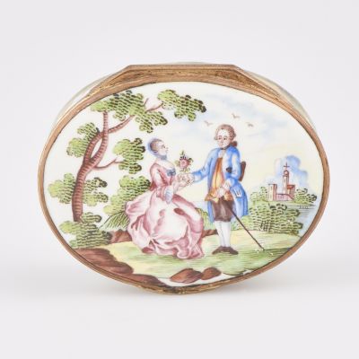 The cover of the oval box opens on hinges its outside shows a couple in scenery, wearing rococo clothes. The inside is decorated with an angel pointing at a cross on the table, with St. Theresa of Avila in front of him. The side of the box is decorated with a copule sitting under trees, playing music. The lady plays the lute, while the man plays the flute.