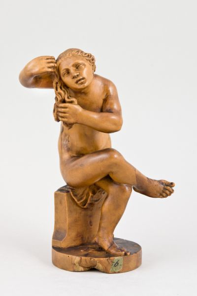 The naked female figure is sitting on a round stand covered with a scarf, resting her right leg on the left, and combing her hair. Its companion piece, the woman pulling a thorn from her foot.(Cat. No. 262). is also in the collection of the Budapest Museum of Applied Arts. They were probably made in the same workshop.