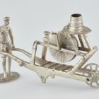The oval, engraved, flat plinth supports the figure dressed in medieval, German peasant clothing, grasping the handles of a wheelbarrow, on which there is a grinding machine with turnable wheel.