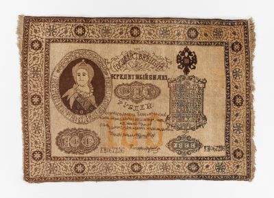 The carpet presents the picture of the 100 rubel Russian note, in brown on a greyish beige back-ground. The number 100 is orange, while the date 1888 is blue. The greyish beige main stripe of the border is enriched with a brown garland, with blue and orange flowers. This carpet is a curiosity concerning its decoration, and was made for western export.