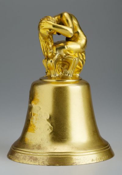 The foot, which contains the bell clapper is bell-shaped, while the handle is shaped like a naked female figure, with her head bent, her long hair falling forward and crouching on the top of the bell.