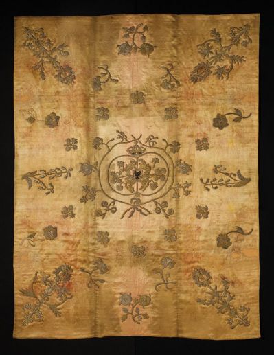 In its four corners are diagonally placed, symmetri-cal pomegranate stems, and on its whole surface are scattered larger flowers, around the smaller ones. The corner motifs and some of the ornaments (flowers) are characterized by the style of the late renaissance Hungarian embroideries. The bluebell and sunflower of the longitudinal side follow, however, the engravings of Western- European pattern-books (for example J. T. Bry: Florilegium Renovatum, Frankfurt, M. Merian, 1641). The pattern in the middle: in the shield is a black embroidered two-headed eagle in the four fields a two-tailed rampant lion, in the first and fourth field with a sword, in the second and third field with a flower above its head. The embroidery was badly damaged after the Second World War, so in the originally stylized coat the placing of the flowers cannot exactly reconstructed. Probably the flowers of the Esterházy coat-of-arms were placed to the coat of Éva Thököly. So the cover might have been made in the years between 1682—1687, that is between the marriage of Pál Esterházy and his acquisition ducal rank. In the Esterházy inventories its first known mention is from 1725: "A bed cover embroidered with gold and silver thread, with beautiful flowers". (Inventarium Thesauri Fraknensis Anno 1725. Almarium Sub. Nris. 75 et 76 Nro. 7. — Inventory of the Museum of Applied Arts 236/1957).