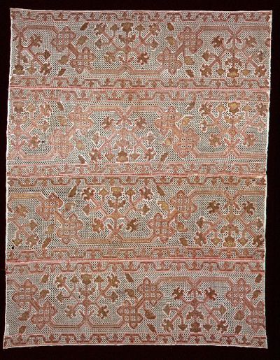 The geometrical pattern of the drawn thread-work is heavily stylized. The looped, broken line of the tendril motif is decorated with opposing bushes of flowers. Drawn thread-work, like cross-stitch embroidery, is closely related to Renaissance designs of European pattern-books in fact, they were used continuously for 150 years and little of Oriental influence can be detected in them. Later variations of these motifs can even be found in 19th century Hungarian folklore embroidery. This tablecloth was sewn together at a later date the embroidered parts originally might have been decorations on aprons. Aprons such as these are worn by Margit Forgács, wife of Petrus Mederus and her daughter in their 1664 portrait.