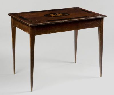 The table stands on four splayed, square prismatic legs. Its frieze hides a broad drawer. The rectangular top shows a maple-veneered, oval field in the middle, showing two putti with clusters of grapes, sitting on clouds. The borders are deco-rated with strap work, enriched with vine tendrils in the corners.