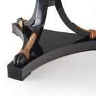 Each of the four carved legs with leaf motifs, springing in a curve from a volute, is carved with a rosette in the middle and lion heads on the sides. They are joined by a turned stretcher. The frieze below the rectangular top covered with blue silk crepe, is carved with a rich line of acanthus leaves on three sides, with a line of drops below.
