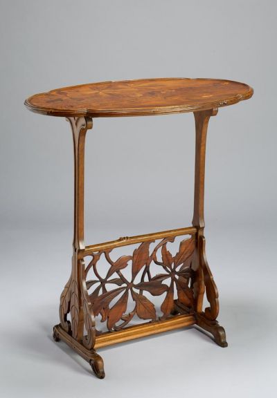 The legs rest on double feet, joined by a pierced plinth, elaborately carved with chestnut leaves. The top is four-lobed, decorated with rich inlay of swallows flying and resting on a wire, under chestnut boughs. It also bears the inscription GALLÉ EXPOSITION DE 1900, SOLIDARITY According to the inscription, this table was made for the 1900 Paris International Exhibition.