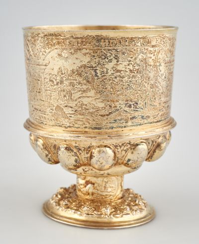 The round base and the cylindrical stem are decorated with masks. The bottom of the flat hemispherical bowl is chased, the cylindrical upper part is engraved with three scenes from the Old Testament: on inv.-nr. 19069: The creation of the birds and fishes. The creation of Adam, The creation of Eve inv-nr. 19072: The sacrifice of Abraham, Joshuah and Jacob, The daughters of Lot.