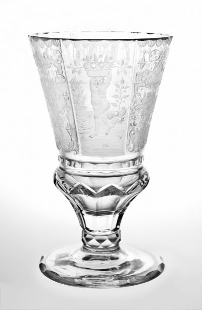 The splayed funnel goblet stands on a curved, splayed stem held by a decagonal foot. The body is divided into six sides by ground lines three of them show naked figures picking apples or holding a basket of flowers. A landscape with buildings or a castle appears on two sides, in a rich framework. One side is without decoration — the space was probably reserved for initials.