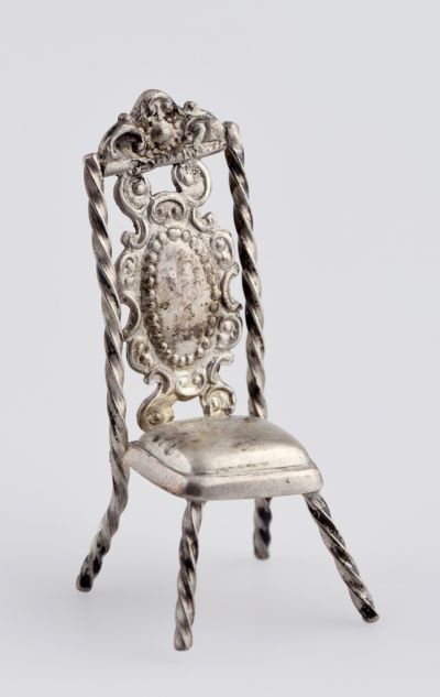 The chair stands four straddled, twisted legs it has a plain, domed seat and a high back support. The back is decorated with a cartouche and with a three-lobed top corniche.