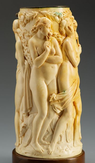 The surface of the cylindrical body is covered with a high relief representation of five naked women, the allegories of the five senses with the traditional attributes. Another analogous work with similar figures, an ivory tankard also attributed to Leonhard Kern and dated about 1640 is to be found in the Fürstenberg Princes' Collection in the family's palace of Donaueschingen.