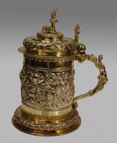 Circular, moulded foot with a sloping foliated foot-band. Between the foot and the cylindrical body a motif of chain loops runs round. On its side is a rich decoration of flowers and foliage. The cover is fastened with a hinge, and has tulips on a wide, sloping band. On the projecting, foliated central part is a cast representation of a deer. The thumb-piece is three-pointed. The handle is semicircular, decorated with a disproportionately small herm. The presently unidentified master's mark and the known city mark are punched on the rim of the foot.