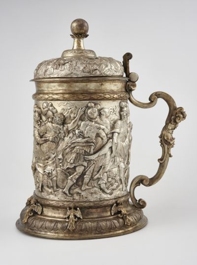 The round, jointed foot is decorated with leaves, supporting a cylindrical body which shows the repousse scene of the Rape of the Sabin women. The rising, lid has a ball finial it is decorated with war scenes between Roman and savage soldiers. The jointed handle shows a relief female figure, with a mask below. The inside of the lid show the coat of arms of György Bánffy and his wife, Klára Bethlen, dated 1691. The original, silver-gilt, hammered, cast and chiselled tankard was made in the seventeenth century and was once owned by the Protestant Church of Debrecen.
