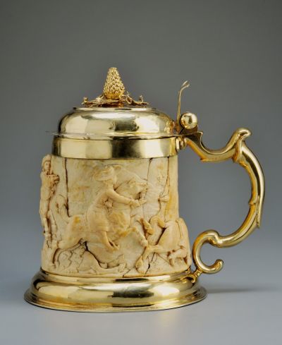 The carved ivory relief represents a battle scene of several figures. The decoration of the cover is a cast bunch of grapes and foliage. The relief may bear some relationship to the works of similar type of J. H. Hornung, active in Schwabisch Gmünd in the last two decades of the 18th century and, according to Christian Theuerkauff, could even be provisionally attributed to this master.