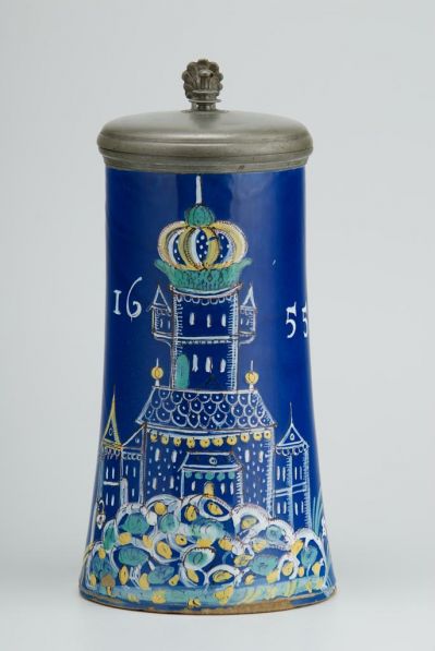 Broad base, narrowing bowl, curving handle. The upper rim is set in tin the tin lid is decorated with a palmette knob and a jointed finial. The surface shows the sketch of a two storied castle with towers and arches. It is painted in green, yellow and white, contoured with manganese, on a blue background. Dated 1655 on the two sides of the castle.