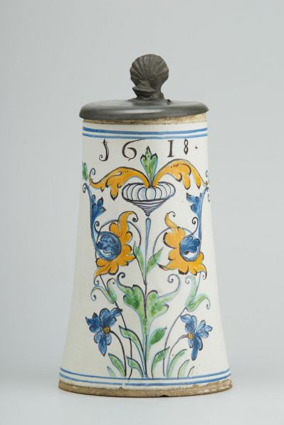 The base is broad the bowl narrows upwards with a curved handle. The tin cover turns and bears a knob decorated with a palmette. It has an added finial. W F: W L: is engraved on top. Double blue lines run along the base and top. Painted in blue, with manganese and blue contours, green and yellow stylized flowers against a white background. The motifs are surmounted by the date 1618.