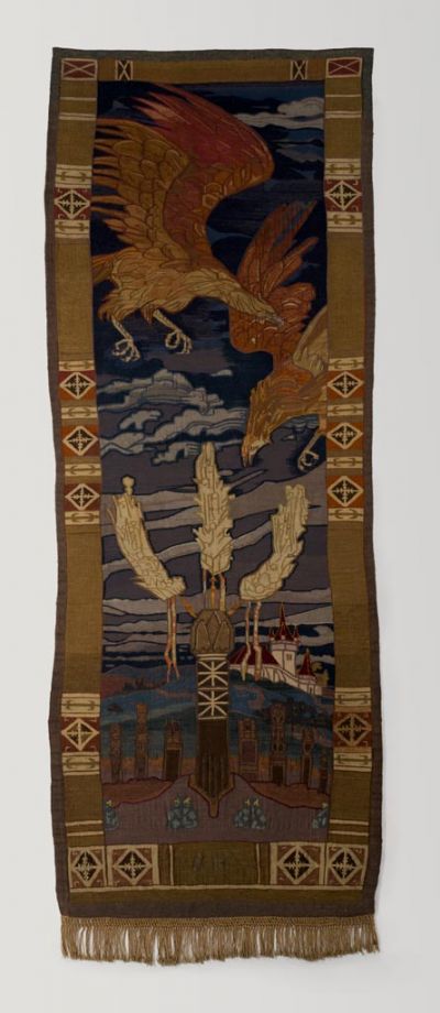In the foreground, there is a village cemetery, with a newly erected wooden grave-post, decorated with ribbons, in the centre. The wooden tower of the church at Kalotaszeg appears in the background, behind gentle slopes. The top two-third of the tapestry is filled with sky and clouds, and the huge eagle figures «guarding» the tomb from above. The gloomy colours - brown, steel-gray, blue, bluish gray - refer to the allegorical meaning of the topic and express misgivings for the tragic consequences of the First World War, the defeat and disaster. The tapestry is bordered with the repetition of geometrical motifs, used mainly on the carvings of grave-posts. The artists at Gödöllő intentionally used the shapes and motifs of Transylvanian folklore. The churches with wood steeples, woodcarvings, Transylvanian embroideries preserve a rich folkloric culture in this region, creating a new opportunity to define a special, national trend of Art Nouveau in Hungary.
