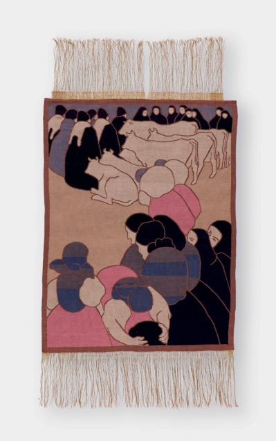 Each tapestry depicts a scene from village life. On the first one, the couple is shown as in an old photo: they sit in a stiff arrangement, touching. Only the main features of their faces appear in the picture, their clothing is just colour patches the flowers in the background curtain are faded. The other tapestry commemorates a great event for contemporary children and grown-ups in villages: the fair. It is a detail of the crowd, viewed from above like a memory. The artist remembers the shapes, lines and colours, the people have no faces. Most of the peasant women and shepherds turn their backs towards the viewer, the only woman pictured facing us bends her head down. There is no horizon in the picture, thus we cannot gain a whole picture of the fair. The border cuts in the clothing of the women, emphasizing the contingency of the scene. Among the Vaszary tapestries it is probably the Fair that radiates most the influence of Emile Bernard (Breton women in the fair, Breton women picking pear, 1888). The works of these both artists depict a frozen activity, with no constructed space around them. The figures and objects are shaped of colour patches placed beside each other. With these principles in mind, Vaszary created his own, individual style. The slightly happier colours of the Couple - purple-pink, white, dark blue, gray and light blue - turn slightly more serious at the Fair - purple pink, bluish gray, blackish blue, white. These tapestries with thier colours, the dynamic, thick contours together with the above principles of composition are outstanding works of Art Nouveau. The above tapestries, together with the peony armchair and the peony curtains, were made for the Hungarian Hall of the 1905 exhibition in Venice, designed by Zoltán Bálint and Lajos Jámbor. From the correspondence of Sarolta Kovalszky and Jenő Radisics (the contemporary director of the Budapest Museum of Applied Arts), it is apparent that the tapestries and the curtains were woven at Németelemér, the upholstery of the armchairs at the neighbouring Nagybecskerek, in two months (see Budapest Museum of Applied Arts, Archives 69, 145/1905). One variant of the Fair was made by the Gödöllő workshop in 1907 (see Magyar Iparművészet Vol. 10, 1907, p.142).