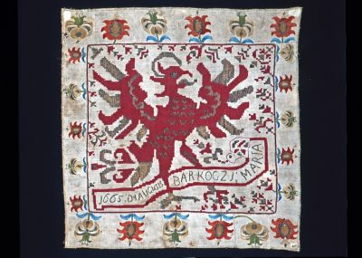 In the middle of the fragment is an eagle with spread wings (symbolizing St John the Evangelist) and with a scroll in its claws bearing an inscription: 1665: DIAUGUSIS BARKOCZI MARIA. The eagle is enclosed by diagonal flowers. The border is a later addition with Turkish motifs of pomegranate buds and blossoms. The pattern of the eagle follows Western European books of lace and embroidery. Its earliest variant can be found in the first volume of the pattern book Corona delle nobili et viruose donne (Venice, 1600) of Cesare Vecellio: there is a bough in the claws of the eagle instead of the scroll. In later pattern books several variants of the same pattern can be found. In Hungary, mainly filet works were decorated with Evangelist figures. The best examples of this are the tablecloths of Kata Bethlen at Olthéviz, Debrecen, Gyulafehérvár and Magyarkirályfalva. The size, shape, the later border and the inscription replacing the name of St. John suggest that Maria Barkóczi, wife of István Holler, Lord Lieutenant of Kükülkő renewed an older fragment of a tablecloth and presented it to the cathedral in Kassa.