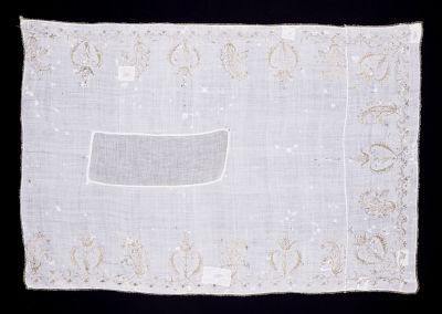 Materials: | cotton canvas (calico) (presumably); gold coloured metal yarn |
