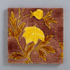 If mounted in checkrow the two tiles above each other create an endless pattern. The floral ornaments on the two units are the same: a curving, camellia-like flower with blossoms among its leaves. However, they are different in the relief production, in the background pattern and also in colouring. One of the two pairs has a lace-like, purple-brown background with small dents  the flowers are shaped in high relief, painted with brownish green and yellow. On the other pair the light green background is squared, with tiny leaves. Due to the applied technique («tube-technique»), only the outside and inside contours of the flower protrude from the tile. Thus, the light brown leaves and the light yellow blossoms are lighter and less natural.