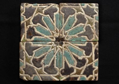 The four tiles fitted together make a pattern. The intertwined white, geometrical ribbon motifs create a network of stars. White, turquoise, yellow and manganese. Companion pieces can be found in the collection of the Budapest Museum of Applied Arts (Cat.No.128). Other analogues with "email en relief' decoration are published by Forrer 1901, pl.XXI,7. There are some similar tiles in the Kunstgewerbemuseum of Cologne which were made in the late 15th or early 16th century in Seville or Toledo. Eva Cserey described the above tiles as being from 15th century Seville.