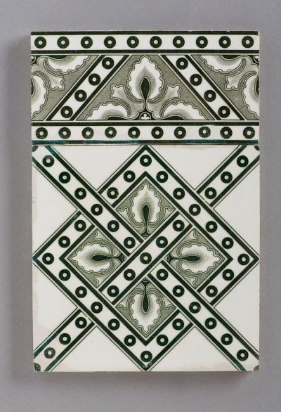The square tiles were used for covering the wall, the rectangular ones for bordering the tile surface. Although these tiles were printed in one colour, the different screen network of the inner lines create the impression of a shaded graphic drawing. The tile is decorated with diagonal white ribbons enriched with circles between two stripes, creating smaller and larger squares on the wall when the tiles were mounted. The smaller squares are decorated with stylized leaves.