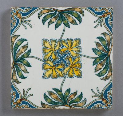 The square tile was used for covering the wall, the rectangular ones for bordering the tile surface. The endless pattern on the square tile shows a flower stem of eight leaves in the middle of each side, with one stem curving towards the centre of the tile. The four flower heads are connected in a square. The corners of the tile are decorated with a flower bulb in a curved field. The border tiles depict a similar flower motif with a slight modification, against a dark-shaded base. The wavy pattern line of three rooted flowers of six leaves and six petals are closed by a white stripe at the bottom and top. The motifs are also contoured with white, the pattern can be continued. It is supposed that the applied transfer picture was not Hungarian. The stylized pattern was printed on the surface in green, painted in brown, yellow and green.