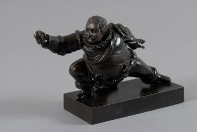 The Falstaff-figure stands in a fencing position on the rectangular plinth. Its body is detachable from the waist-line, concealing the ink well the head hides the powder container and can also be detached. There is an engraved inscription on the plinth, in cursives: So lag ich und so führte ich meine Klinge (So I lay down and so I led my blade).