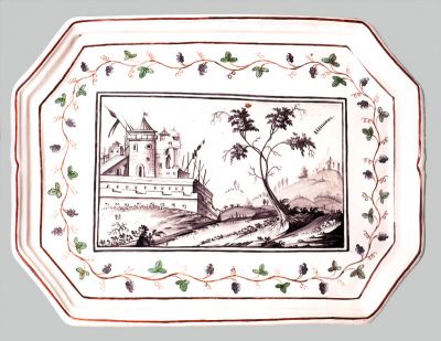 Octagonal, with a rising rim and a horizontal brown border. The surface shows a landscape in a rectangular field, enframed by vine tendrils. The picture is of a castle with towers, surrounded by mountains, painted in gray. The colours of the framework are: blue, green and brown. Marked with a T on the bottom, which was a marking of the Tata manufactory.