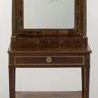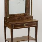 The four splayed, prismatic legs wear bronze shoes  they are joined by a curved shelf at the front. There is a drawer in the frieze  its panel is decorated with an inlay of a horizontal rectangle shape, and a keyhole shield of garland motifs in the middle. The inlay is enframed by gilt strap- work. The rectangular top shows a double field of copper filet inlays, with a narrow superstructure behind: three small drawers support a fluted column of bronze decoration on each side  the protruding marble top rests on the columns. Three edges of the marble top are decorated with a low, pierced rim of figures. The mirror and frame are placed between the columns, forming a horizontal rectangle.